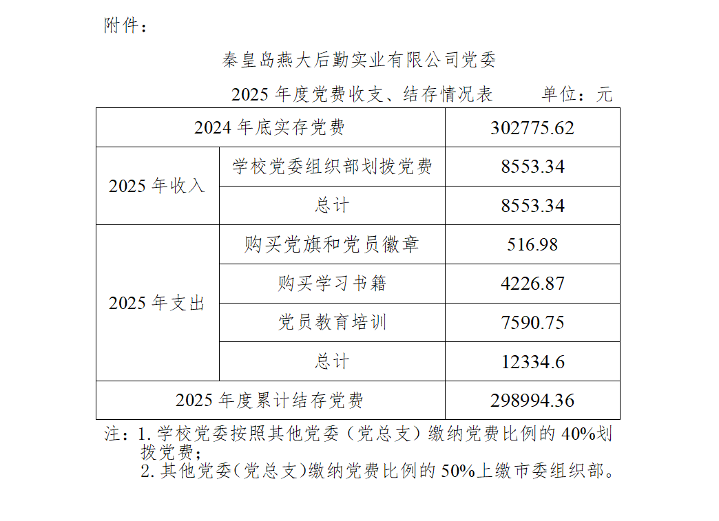 2025年度,秦皇岛燕大后勤实业有限公司党委认真贯彻执行《关于中国共产党党费收缴、使用和管理的规定》(中组发〔2008〕3号)《关于进一步规范党费工作的通知》(组电明字〔2017〕5号)等相关文件要求和学校党委组织部的要求,较好地完成了全年党费收缴任务。现将2025年度秦皇岛燕大后勤实业有限公司党委党费收缴、使用情况通报如下: